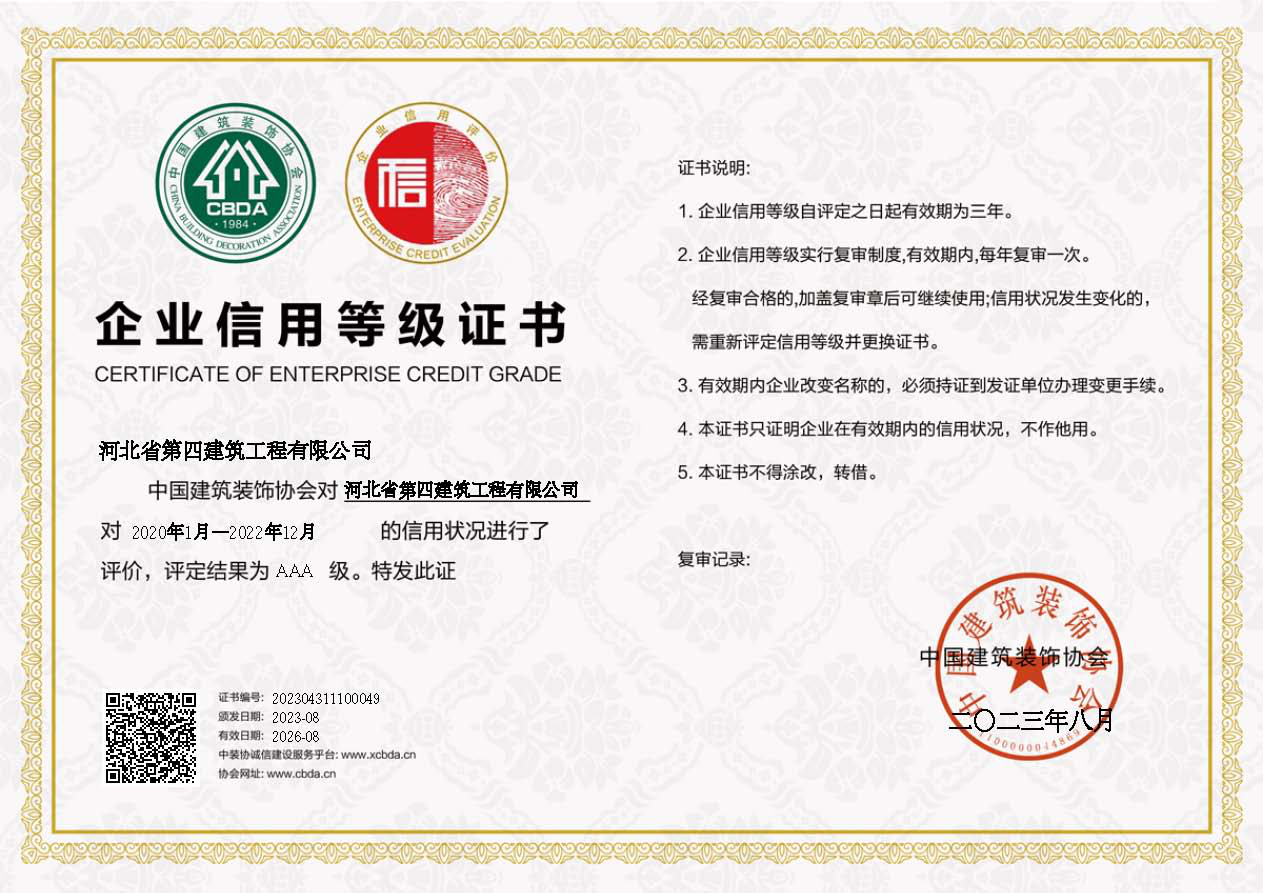 河北四建:2023年河北省建协AAA信用等级证书